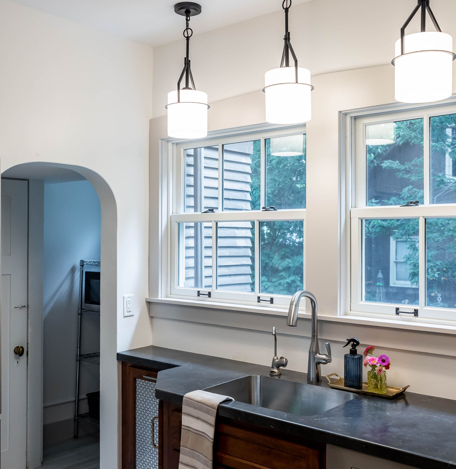 And then there are the headers. Throughout the rest of the home, every door and window is crowned with a distinctive pointed header — a detail that gives the house its personality. Replicating that custom profile in the kitchen's doorways and new window wasn't a simple task, but it was a necessary one. The result is a kitchen that doesn't just respect the house. It belongs to it.