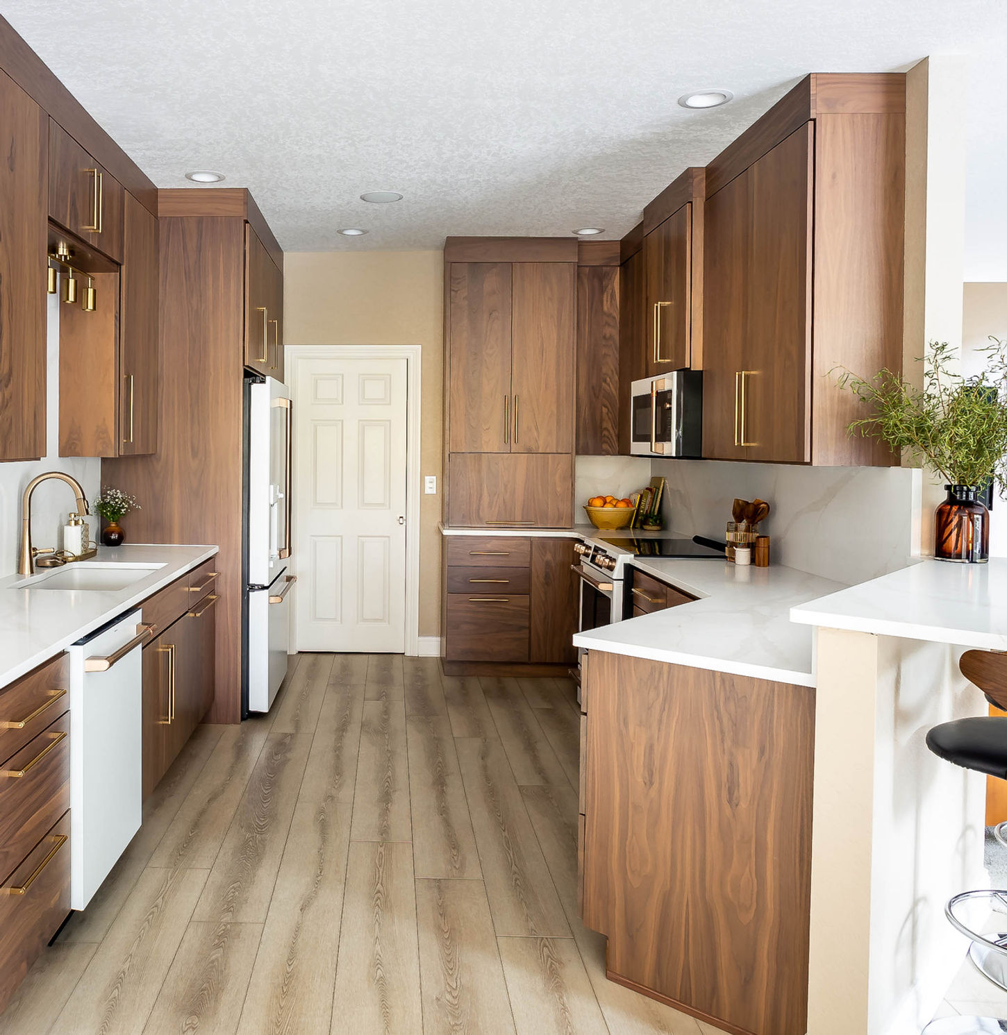 The client's aesthetic trended toward the modern style, so we chose flat drawer and door fronts, but chose a warm toned walnut to bring in the mid-century influence without leaning too austere. The warm veining in the countertops and backsplash brings a factor of elegance.