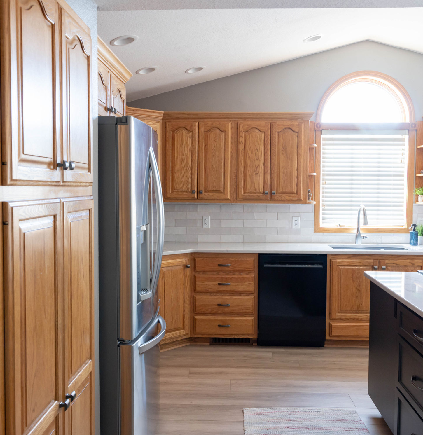 The oak cabinets were sturdy. The layout worked, mostly. But the kitchen still looked and felt like the 1990s — and no amount of styling was going to change that. The island didn't flow the way they wanted, seating was limited, and the popcorn ceiling and aging ceramic tile weren't doing the space any favors.