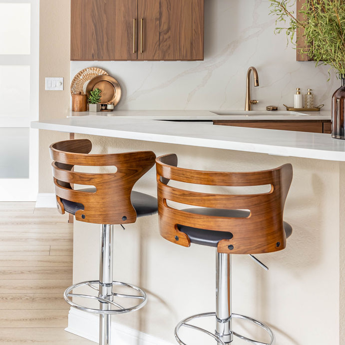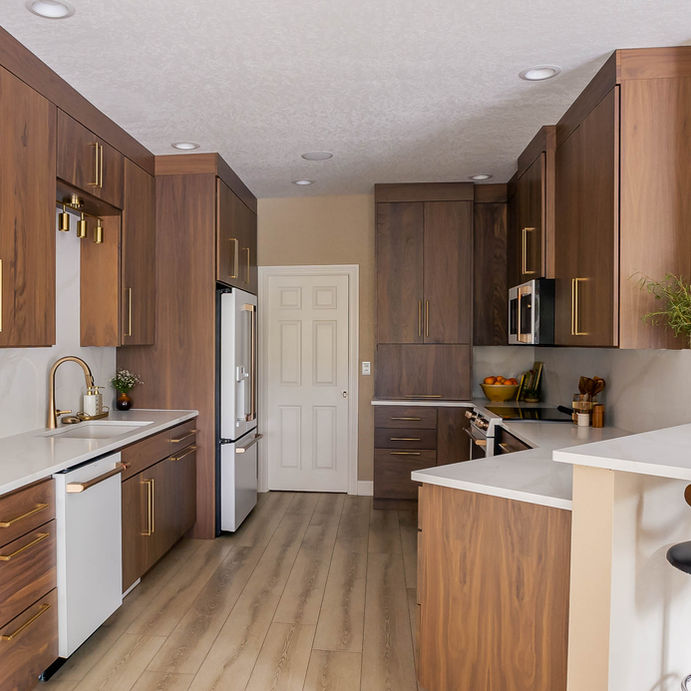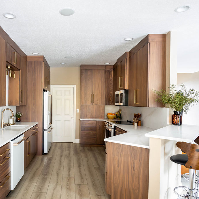 This Boxwood Drive kitchen blends timeless mid-century character with a sleek, modern sensibility. The homeowners chose to maintain the existing footprint while transforming every surface. We replaced dated finishes with rich slab-front walnut cabinetry, a stunning quartz countertop and backsplash with subtle veining, and elegant gold hardware and fixtures. The result is a space that feels both elevated and effortless, capturing the warmth of natural wood and the polish of modern design.