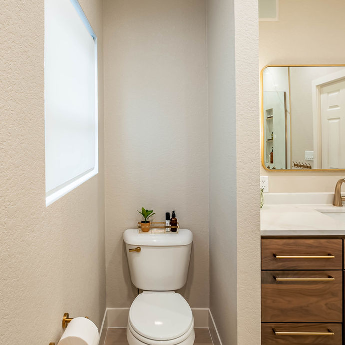 Both bathrooms in this Boxwood Drive home were designed for function and modern comfort while keeping a warm, mid-century feel. In the primary bath, a dated jetted tub was replaced with a spacious shower wrapped in porcelain slabs, paired with walnut cabinetry, quartz countertops, and gold fixtures for a clean, timeless look. The girls’ bath carries the same warmth in a lighter, more playful way — with walnut cabinetry, mint-green tile, and gold accents that feel fresh but cohesive with the rest of the home.